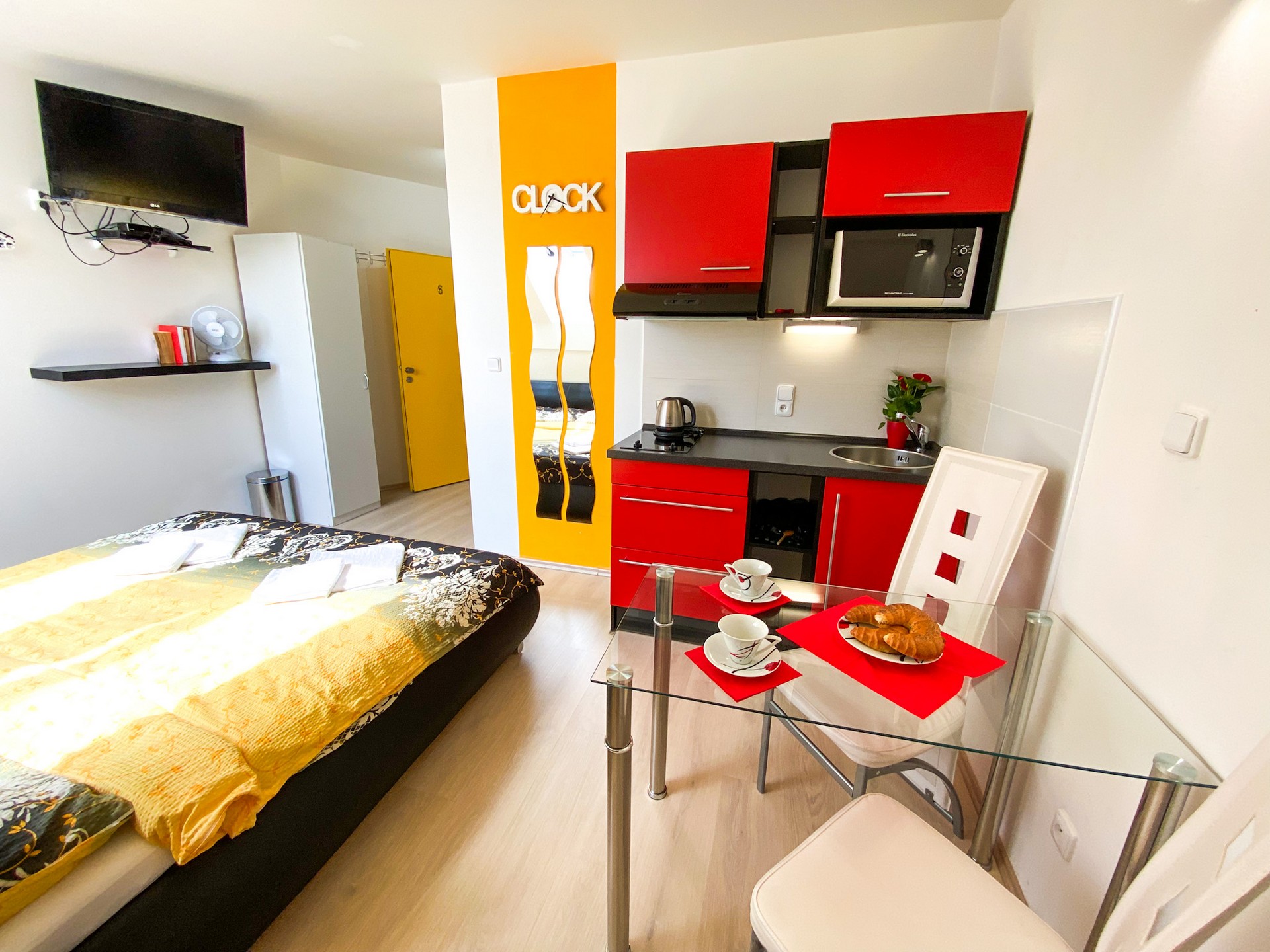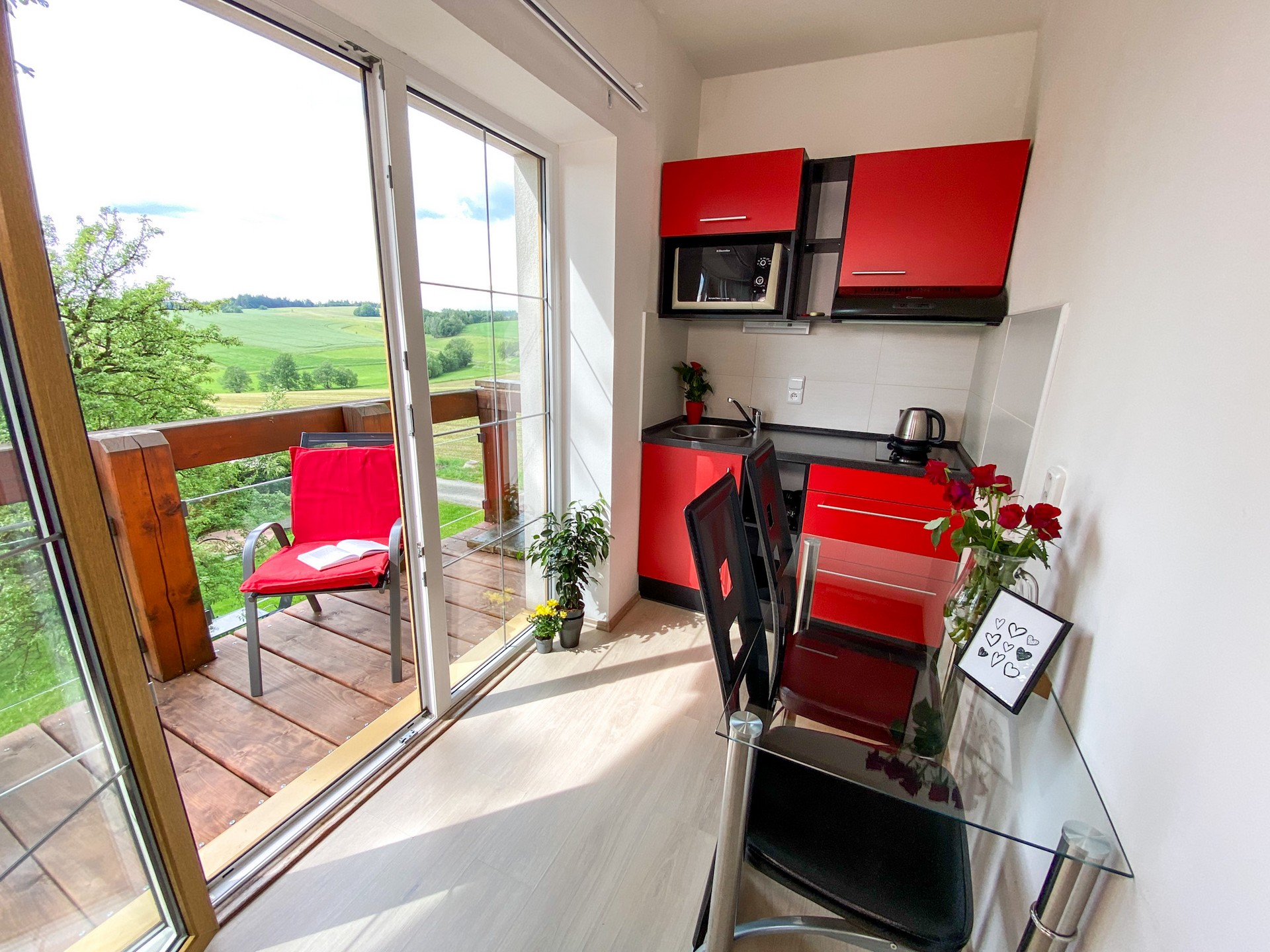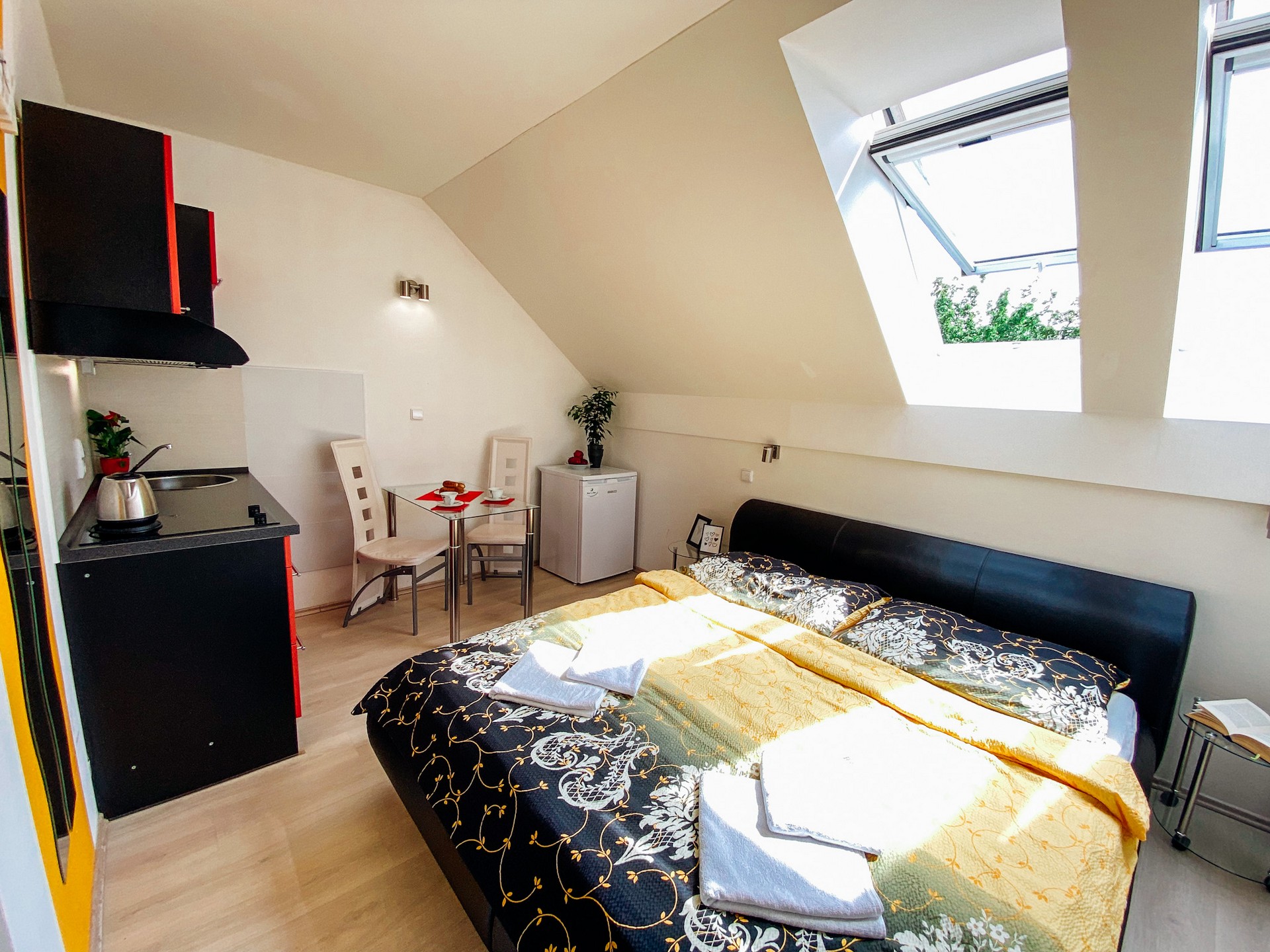 Součástí pokojů je prostorná koupelna a praktický kuchyňský kout, díky kterému si můžete připravit menší občerstvení nebo kávu. Některé pokoje disponují také terasou se zahradním nábytkem, kde si vychutnáte odpolední odpočinek nebo večerní posezení.